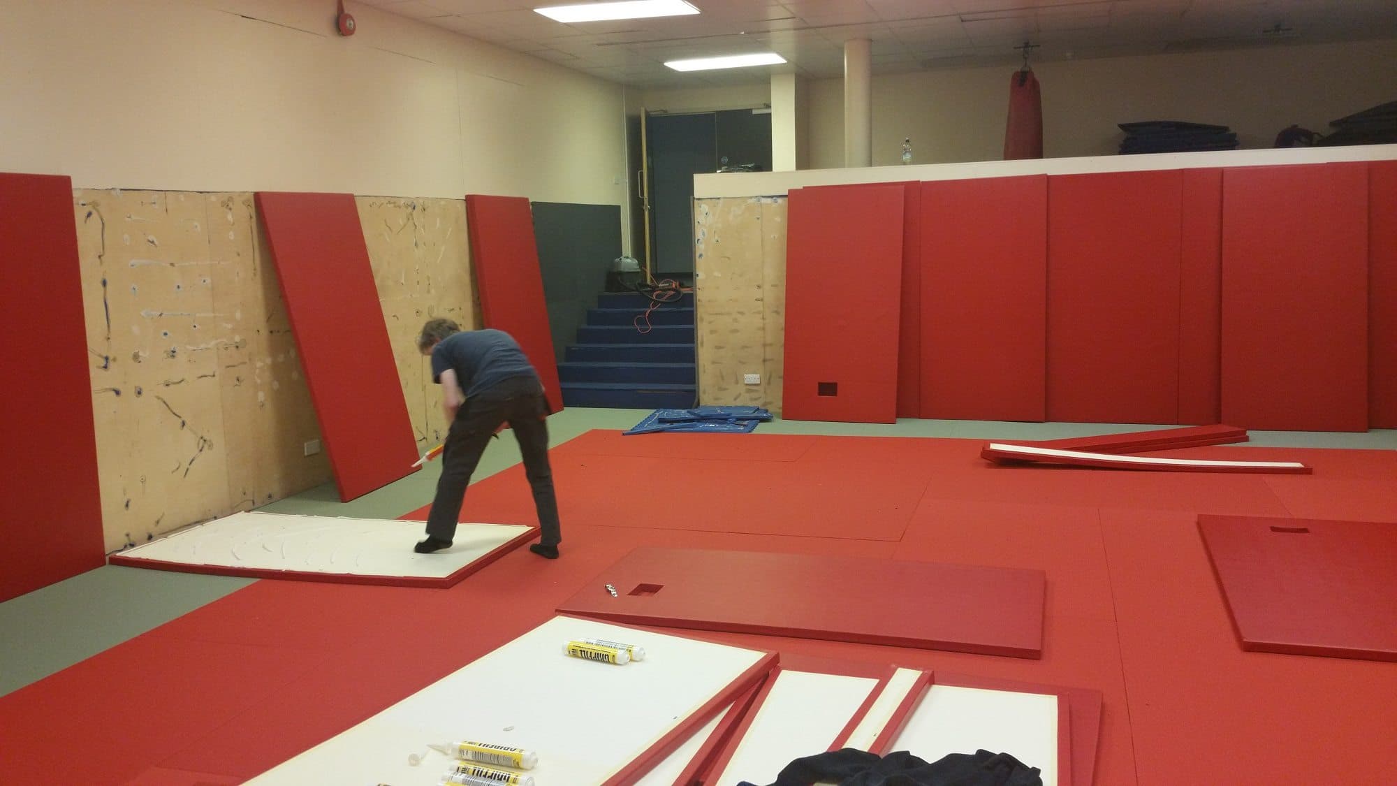 The University of Southampton approached us to completely refurbish their DOJO at the Jubilee Centre. This was no small task as there was close to 100 square meters floor space and almost 40 linear meters of wall padding needed. As the walls had some tricky parts to maneuver and cut around, and also an irregular overall floor space, we went down to Southampton to carry out a full site visit. This was necessary as there were almost as many custom wall pads as there were standard size ones!